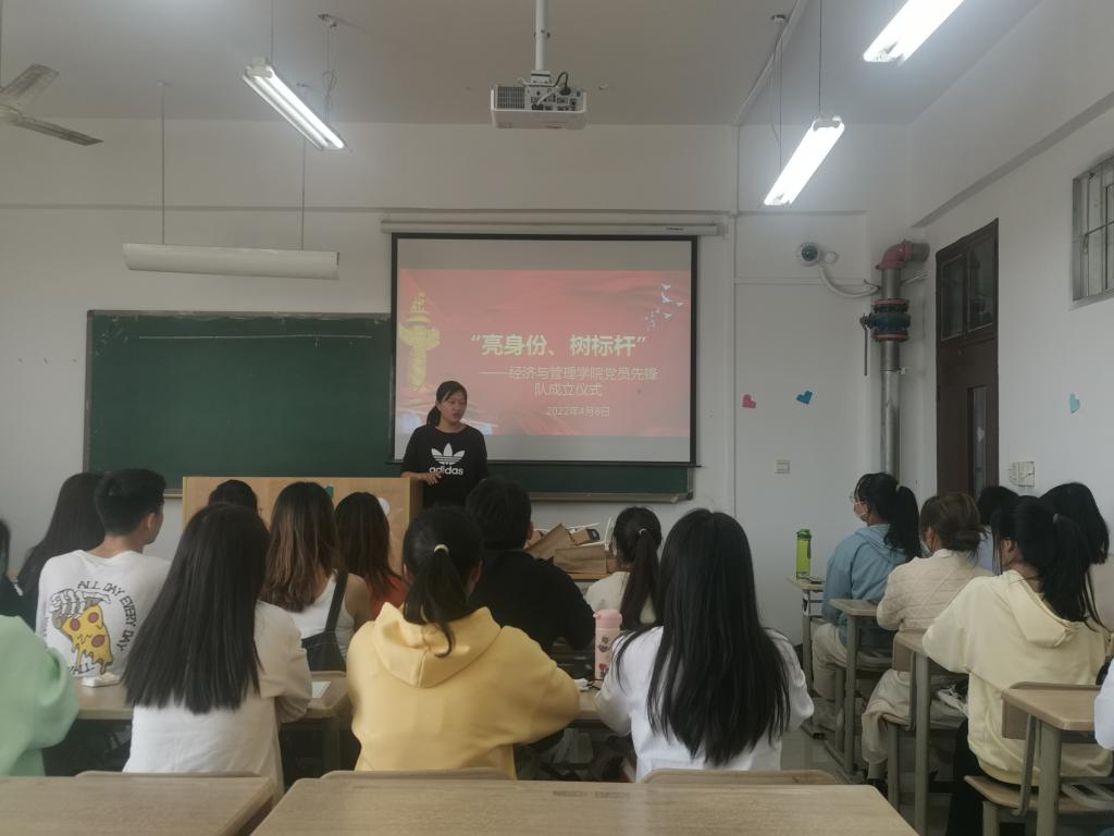 2022年4月14日,经济与管理学院在一教楼B401开展以“亮身份、树标杆”为主题的党员先锋队成立仪式,学院学生支部第一书记吴思瑾老师主持本次仪式。