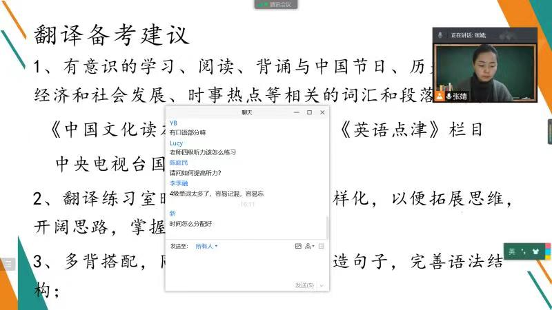 2021年11月10日和17日下午,通过腾讯会议平台,外国语学院开展了三场学法指导专题讲座,主讲老师分别是副教授张婧和讲师高雨菲、郭明雅,参加讲座的有2021级和2020级beat365非英语专业的上千名本科生。