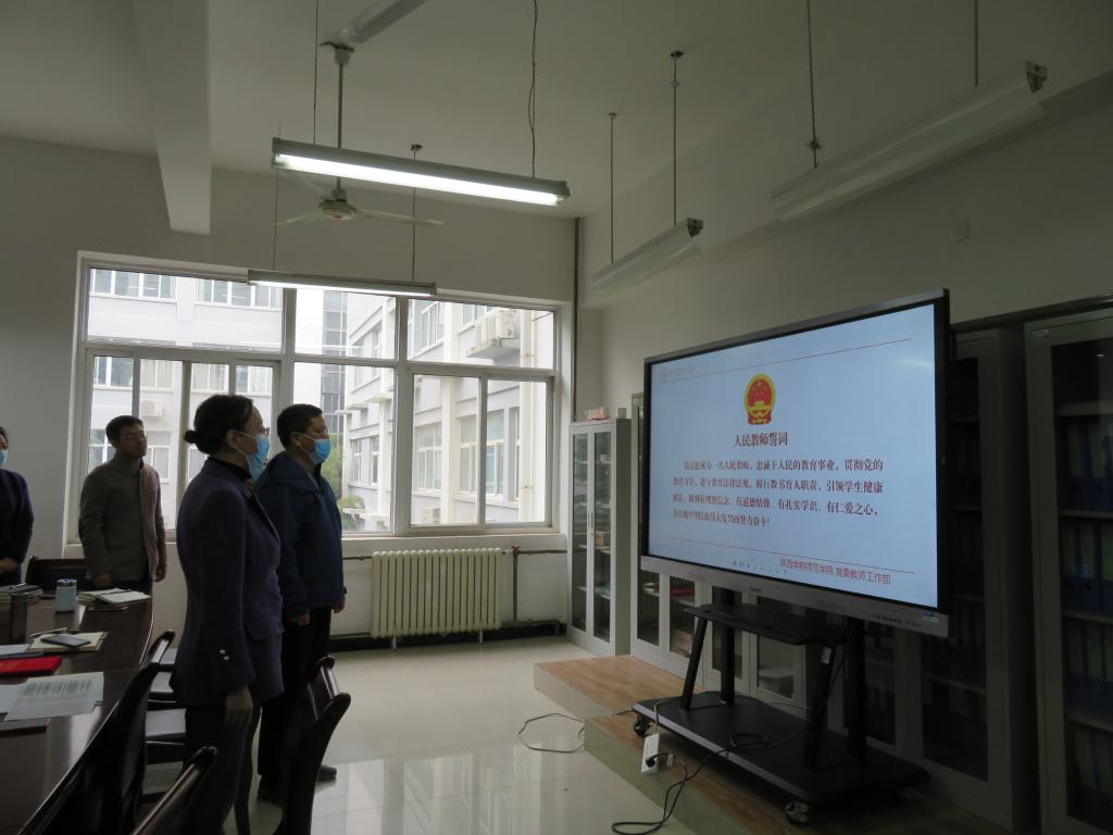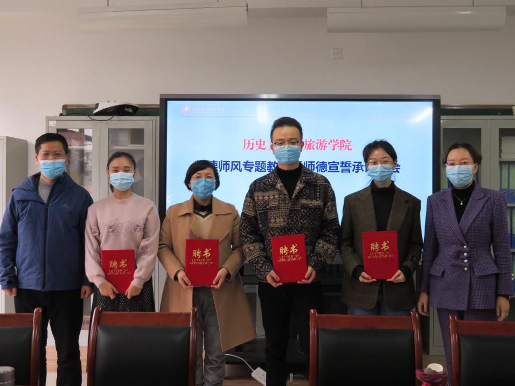 大会上,学院举行了2021级班导师的受聘仪式,为受聘新生班级班导师的赵喜惠、荆玉洁茹、余欣悦、张景超等几位教师颁发了聘书。全体教师签订了《历史文化与旅游学院2021年度师德师风建设承诺书》。在学院党委书记童广运的带领下全体教师进行了师德宣誓,大家一致表示要坚定育人初心,坚守职业信念和职业操守,严守课堂纪律,增强底线意识,时刻在工作生活中严格要求自己,争做新时代“四有”好老师,以赤诚之心、仁爱之心投身教育事业,为学校和学院的教育事业做出积极贡献。
