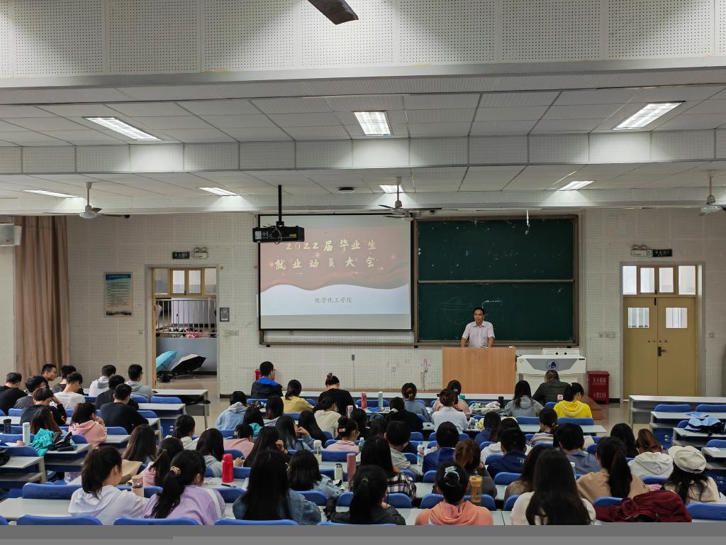 为进一步帮助毕业生树立正确的就业观和择业观,消除毕业生在就业中的困惑,使全体毕业生了解就业形势及就业政策,转变就业观念,9月28日下午,化学化工学院在积学楼C座二层阶梯教室召开2022届毕业生就业动员大会,学院院长李连庆、书记杨泉、副书记彭晓江、毕业班辅导员陈晓璐以及2022届毕业生共计160余人参加了会议。
