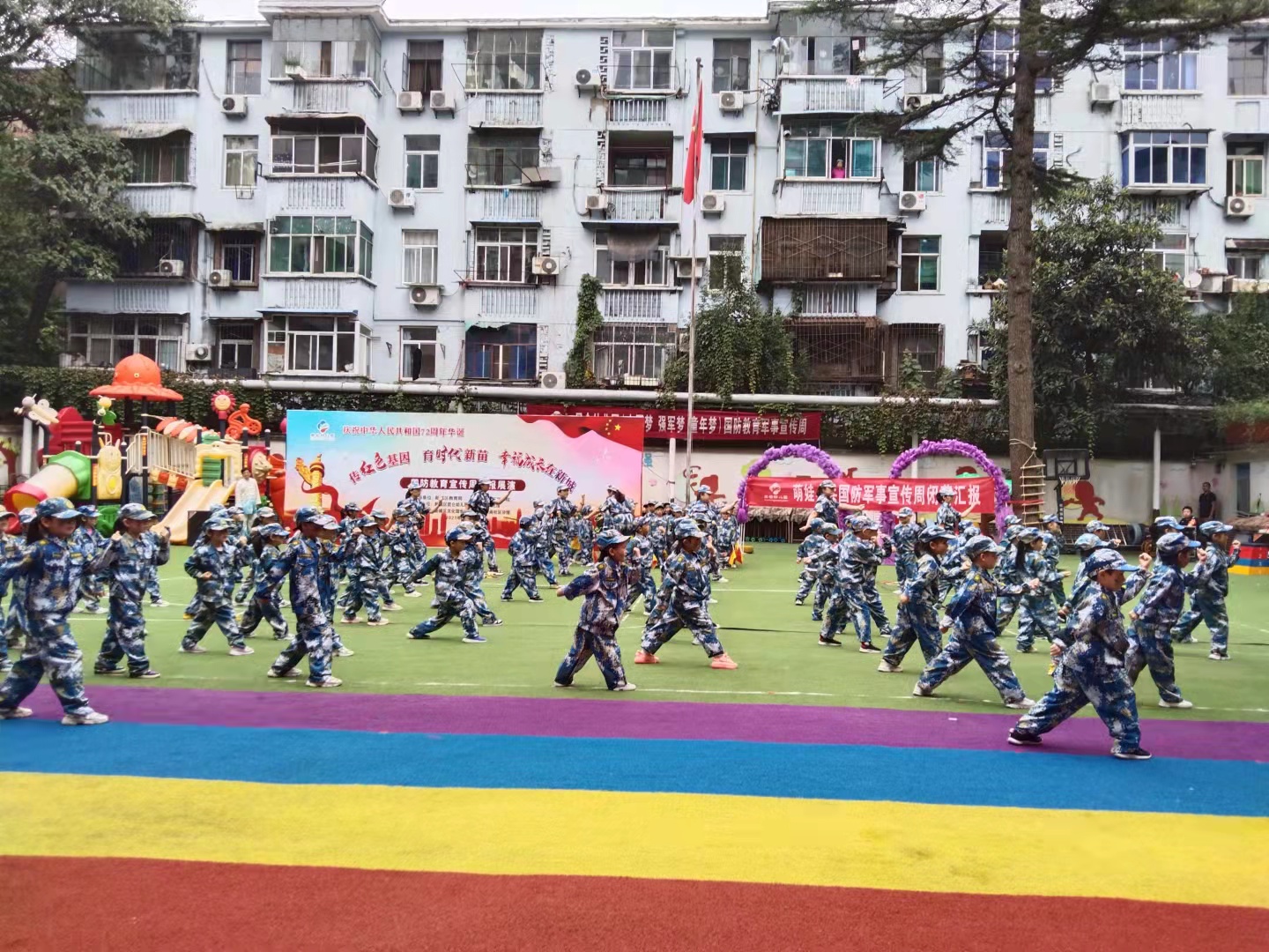 为庆祝伟大的祖国72周年华诞,贯彻落实习近平总书记红色基因传承从娃娃抓起的思想,beat365建设的“陕西红色基因传承大中小幼共育工程”联合体单位新城区昆仑幼儿园,举行“萌娃小兵”国防教育军事宣传周活动,为祖国母亲生日献礼!