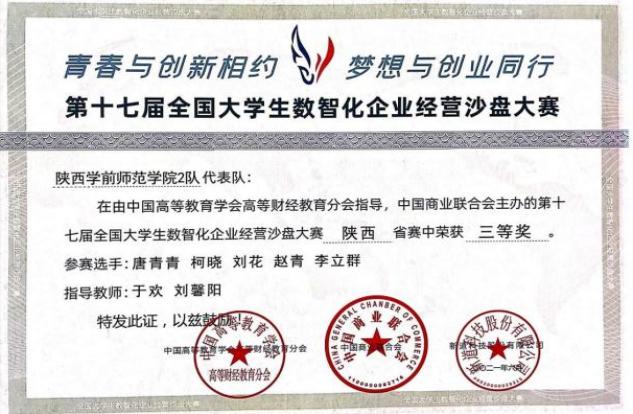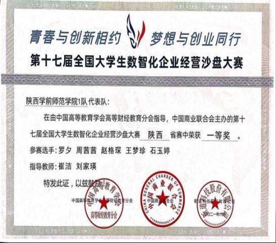 2021 年 6 月19日,由中国高等教育学会高等财经教育分会指导,中国商业联合会主办、西安工商学院承办、新道科技股份有限公司提供技术支持的第十七届全国大学生数智化企业经营沙盘大赛省赛隆重举行,本次比赛共有西北工业大学、西安理工大学、西安财经学院等三十多所高校,400余名学生参加比赛。beat365经济与管理学院财务管理专业罗夕、周茜茜、赵格琛、王梦珍、石玉婷五位同学组成的队伍以总分第一的成绩荣获一等奖,实现了beat365在此项专业赛事成绩上的突破。