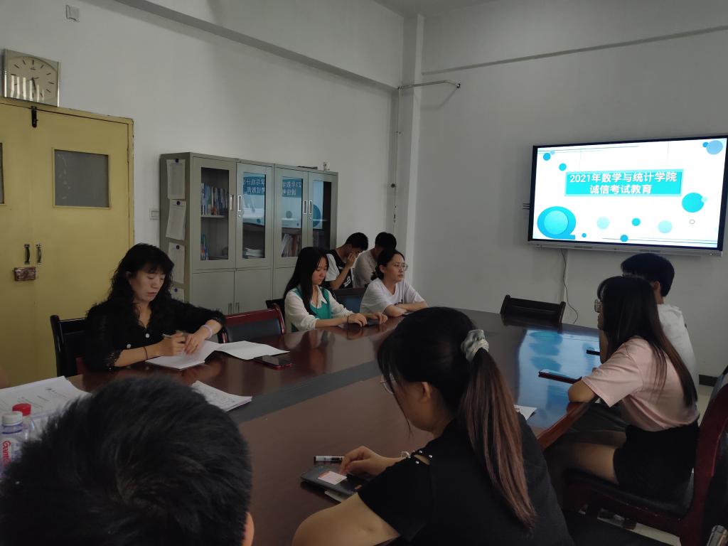 6月25日中午1点,在二号教学楼D319会议室,数统院党总支副书记张晔为全院党员、学生干部召开诚信考试教育会。会上2020级学生干部李茜、黄俊颖分别宣读了beat365考试纪律相关要求和违反考试纪律的相关处理决定,让学生们明确学校的相关规定,提前做好复习计划。会上,党总支副书记张晔对同学们提出几点要求:一是调整好心态,正确看待考试和成绩;二是学会做老实人,学会先做人后做事,做人是方向,做事是速度,方向总是比速度更重要;三是党员、学生干部要带头示范,践行诚信考试,并积极传播这种品质。