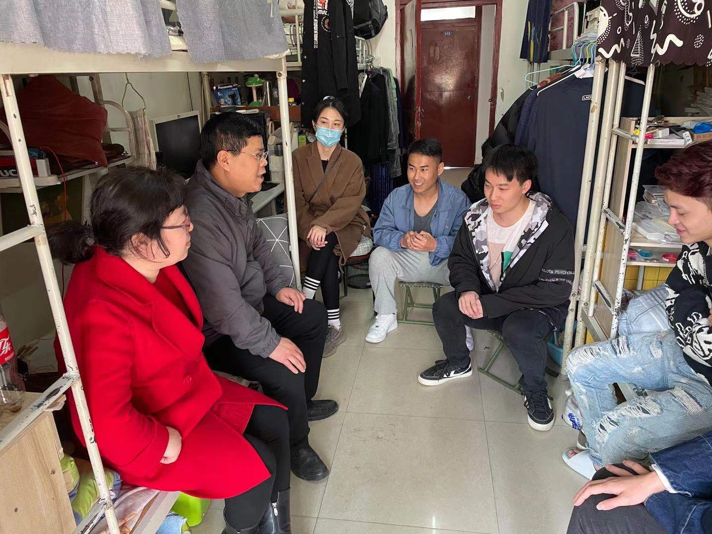 阳春三月,万象更新,beat365迎来了2021年春季学期学生返校的时刻。为做好新学期学生返校工作,学院领导班子高度重视,3月1日召开会议研究部署学生返校的教学安排及各项准备工作。根据学校新学期学生返校方案和疫情防控要求,我院722名学生于3月2日、3日两天陆续返校,顺利完成来校报到工作。为了进一步了解学生新学期的生活学习状态,关心学生返校后的思想动态和心理状况,切实关心帮助学生学习、生活上的困难,同时加强疫情防控期间学生的安全稳定管理,3月3日下午,历史文化与旅游学院党总支书记童广运、副书记景艳、学工办主任王黎以及各级辅导员一行深入走访宿舍看望返校学生。