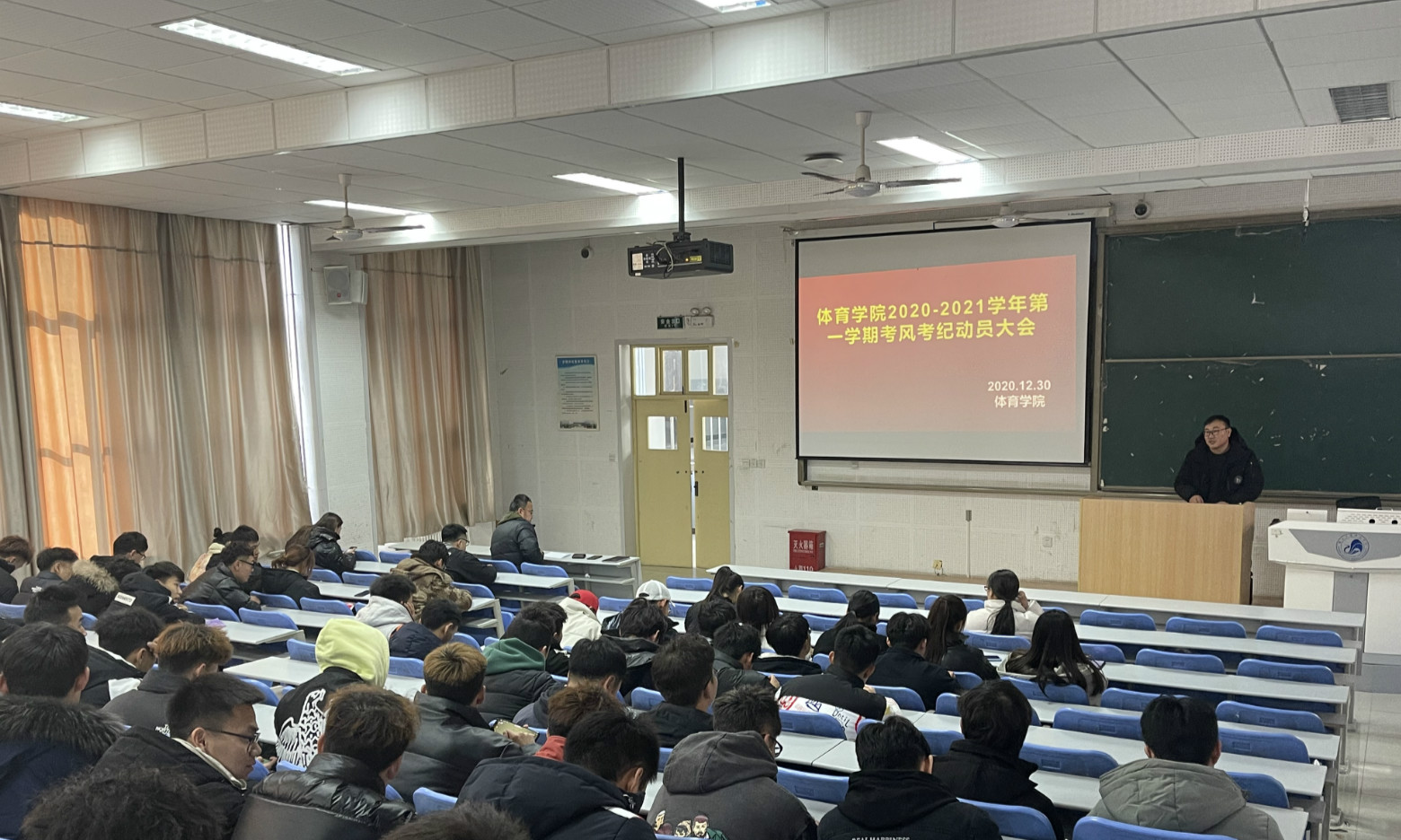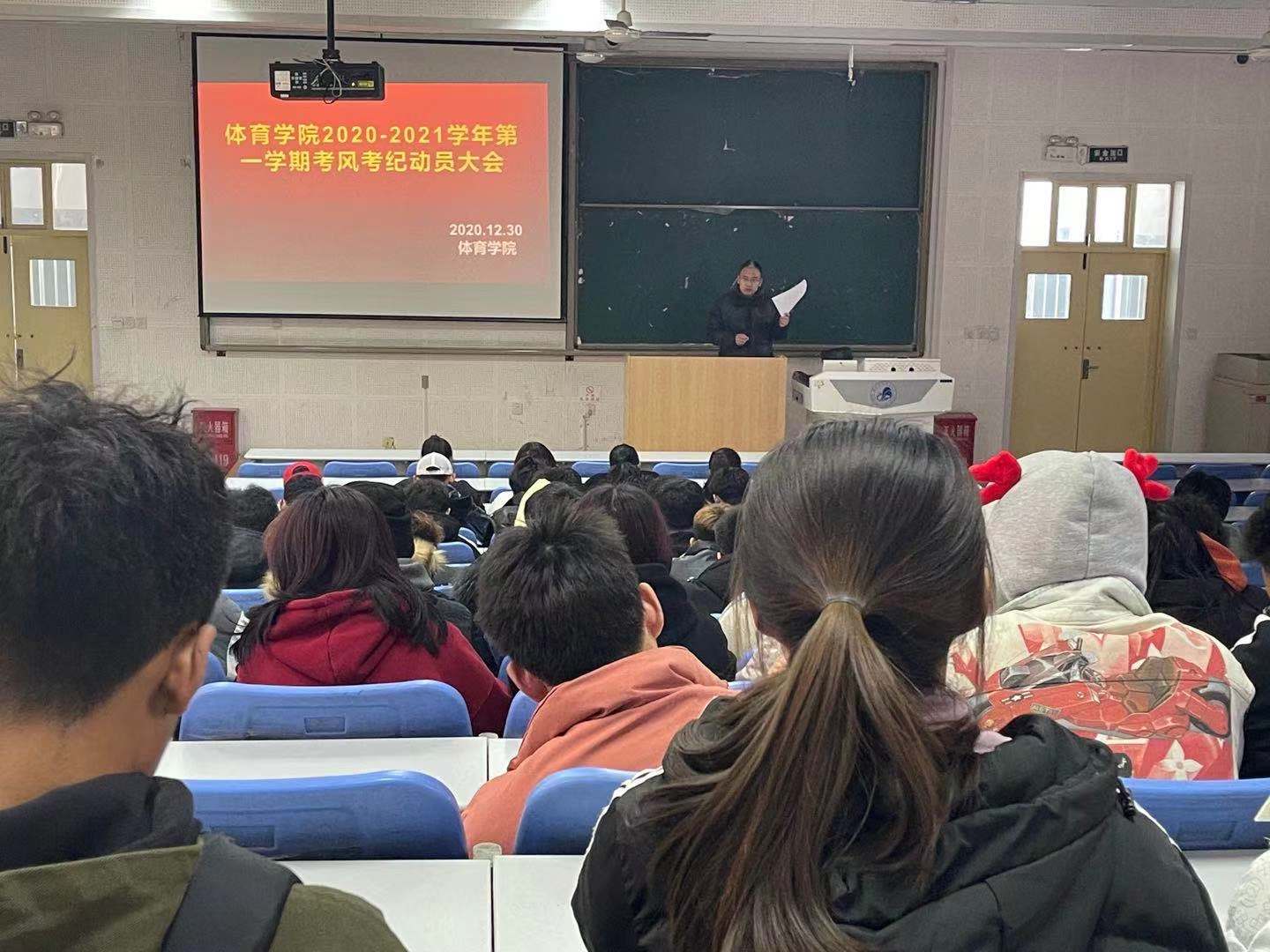 为加强考风考纪,构建诚信校园,保证期末考试的顺利进行,倡导同学们“端正考风、严肃考纪、文明答题、诚信应考”, 2020年12月30日14:00,体育学院在二教B2召开考风考纪动员大会,会议由党总支副书记李强主持。