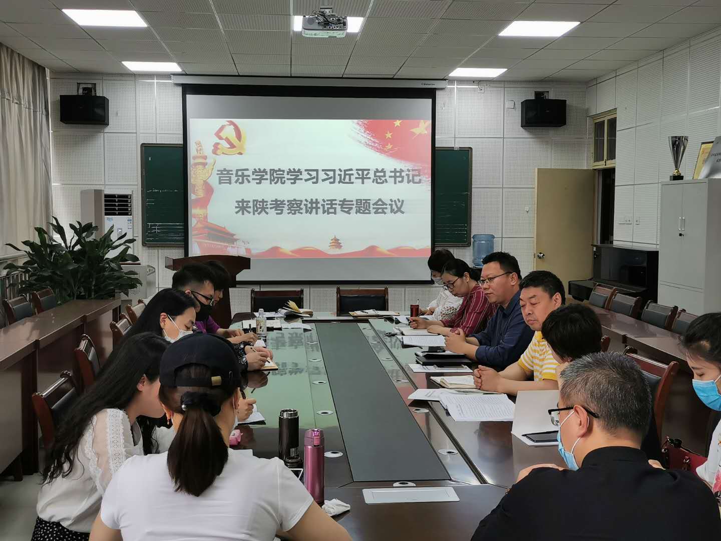 5月15日下午音乐学院召开学习习近平总书记来陕考察重要讲话专题会,学院党政领导、各党支部书记,学科、学术带头人,各教研室、教学部、实验室主任,教学、科研秘书,分会主席参加了会议。会议由党总支书记仵录让同志主持。