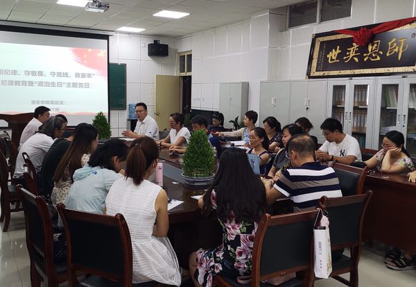 【音乐学院】音乐学院党总支于7月26日下午组织全体党员和干部在学院会议室召开了“明纪律、知敬畏、存戒惧、守底线、做表率”纪律教育专题学习暨“政治生日”主题党日活动。此次活动由党总支书记仵录让同志主持。