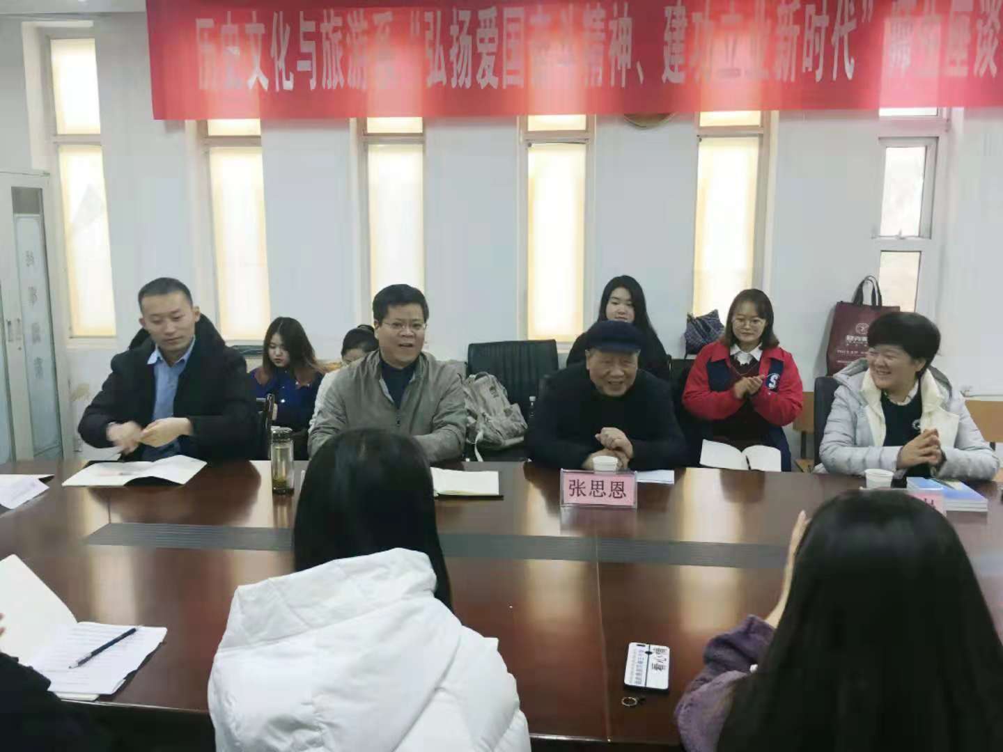 二是召开师生座谈会。参观完校史馆,历史文化与旅游系在系会议室召开了主题师生座谈会。系党总支书记童广运首先引导大家认识到在知识分子中开展“弘扬爱国奋斗精神、建功立业新时代”活动的重要意义,对进一步开展好此项活动作出部署。他向与会师生介绍了张思恩教授,并对张老师的到来表示热烈欢迎和衷心感谢,同时号召全体师生以习近平新时代中国特色社会主义思想为指导,在新时代将个人命运同国家和民族的命运紧密联系起来,最大限度地激发奋斗热情,立足岗位自觉弘扬践行爱国奋斗精神。系主任李岩教授以自己曾经和张老师一起的工作经历及感受,动情地与在座师生们分享了“师院人讲陕师院故事”。 张思恩教授在座谈会上谈到,非常高兴能够来到陕师院历史文化与旅游系这个大家庭和大家一起座谈交流。作为老教院人,亲眼目睹了学校日新月异的发展变化,也高兴的看到一代代莘莘学子在美丽的神禾校园成长成才。张老师最后寄语大家:一定要重视本科基础知识的教育学习,在加强专业知识学习的同时要进一步增强责任感和使命感,在学习和工作中要热爱祖国,建功立业,担当起民族复兴的重任。 三是开展交流研讨。在座谈会上,辅导员任柏阳老师分享了他的感受和体会,他谈到,爱国奋斗精神,是一种知行合一的实干担当精神。