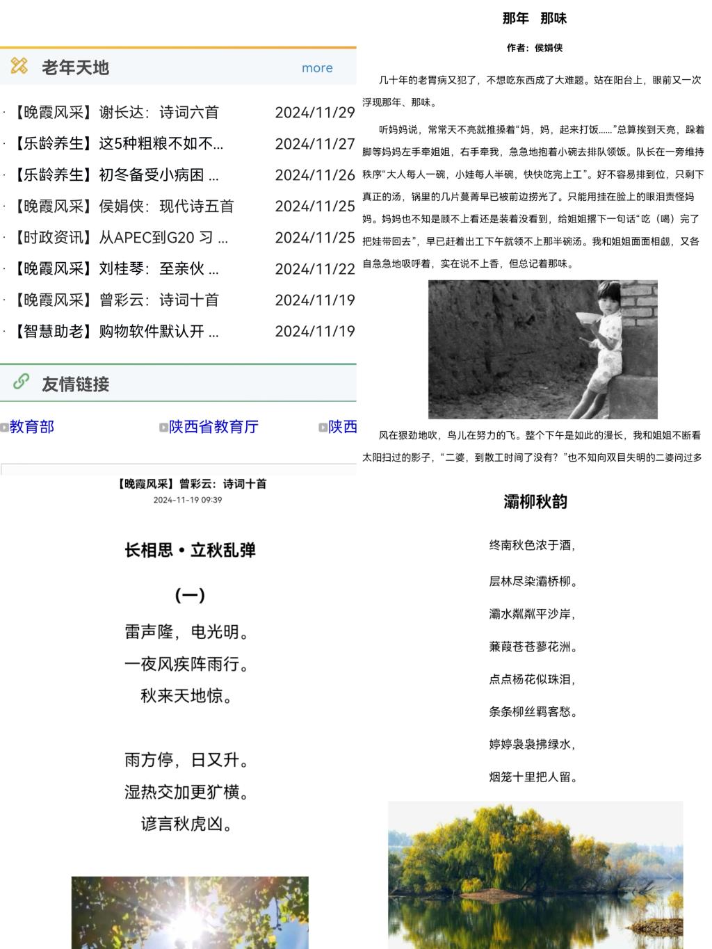 自今年十月份以来,为更好地服务离退休老同志退休生活需求,丰富离退休老同志的精神文化活动,展现beat365离退休老同志“老有所学、老有所乐、老有所为”的精神风貌,为老年群体搭建一个可以学习知识、展示才艺、交流心声的平台,增强老年群体的归属感和幸福感,离退休工作处对“老年天地”专栏进行了改版设计,先后增设了【晚霞风采】、【智慧助老】、【乐龄养生】、【时政资讯】等版块,努力为离退休老同志提供多样化的网络学习需求。与此同时,重点针对“晚霞风采”进行推介,动员鼓励老同志们将记录退休生活的见闻感受、生活体验及书法绘画摄影作品等,以文字或图片的形式向离退休工作处网页“老年天地”专栏投稿。征稿活动开展以来,极大地激发了老同志们的创作热情,受到老同志们的普遍关注和积极响应。截止目前,征稿先后收到散文、诗词、书法、摄影、随笔等投稿100余件,经离退休工作处审核编辑后,已在部门网页“老年天地”专栏【晚霞风采】陆续发布11期,供全校师生浏览欣赏。