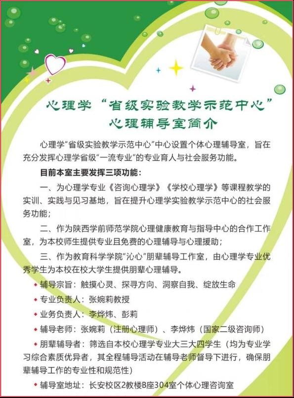“沁心”朋辈辅导工作室是教育科学学院设立的协同育人平台,由心理学专业师生,携手学生社团“沁心社”,由遴选出的专业综合素质优秀学生,为广大学子们提供有品质的、无偿的专业心理帮助。