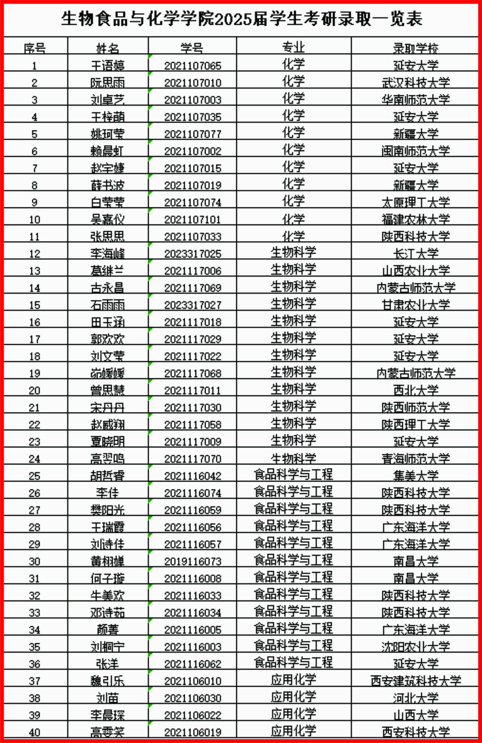 春风送捷报,硕果满枝头。2025年全国硕士研究生招生录取工作即将结束,生物科学、食品科学与工程、化学、应用化学四个专业共计40名本科毕业生成功考取硕士研究生。这份亮眼的成绩单,是学院深耕人才培养、创新育人模式、精准助力考研的全面体现。