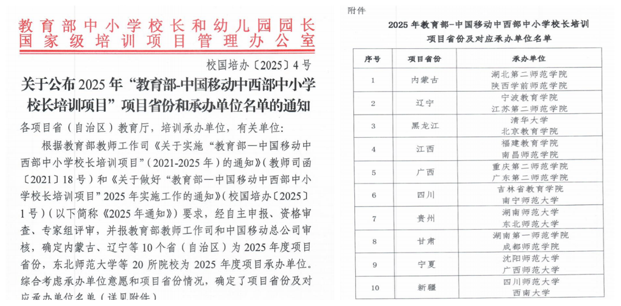 近日,接教育部中小学校长和幼儿园园长国家级培训项目管理办公室通知,beat365成功入选2025年“教育部-中国移动中西部中小学校长培训项目”全国20家承办单位之一,承担内蒙古自治区巴彦淖尔市、赤峰市共计54名管理者和中小学校长的培训任务。