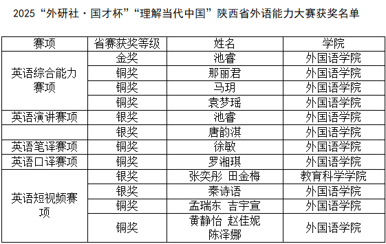 本次比赛由陕西省教育厅主办,以深化外语教育改革、培养国际化复合型人才为目标,覆盖英语、多语种及国际中文等多个类别,吸引了全省各高校众多优秀选手同台竞技。外国语学院精心组织选拔与指导,鼓励学生以赛促学、以赛促练,此次获奖是学校外语教学成果的集中体现,外国语学院将以此为契机,持续提升教学质量与人才培养水平,助力学子在国赛舞台上再创佳绩。