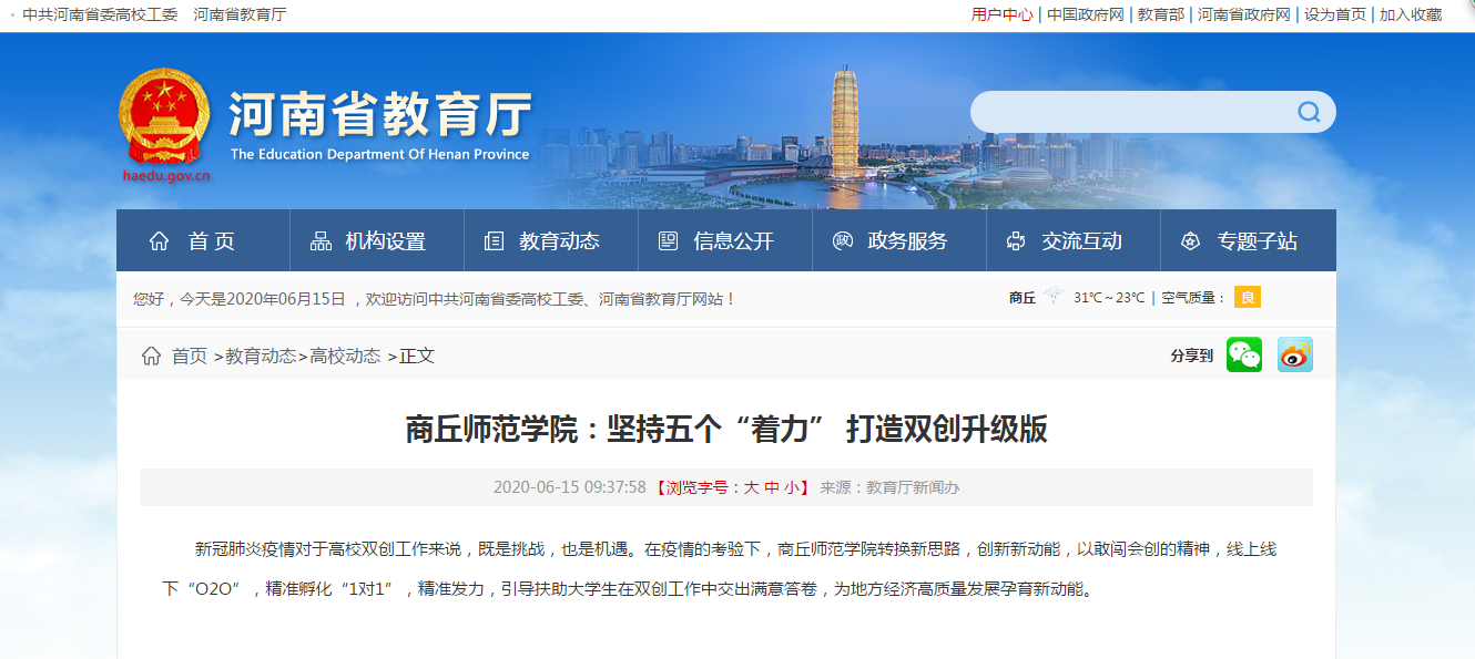疫情期间,商丘师院聚焦融创协同,双元互动的矩阵型“12345”创新创业工作模式,大力实施线上“1+M”创客空间培育工程,探索“产学研创训”的工作方法,深入推进专创、校市、产教融合,培育融创校园线上文化。通过认真开展“把灾难当教材,与祖国共成长”主题系列活动,创新众创空间等创新创业载体运营服务模式,通过线上沙龙、直播论坛等有针对性的开展创新创业项目孵化服务工作,助力学生塑造良好的创业人生观及创业能力的提升。