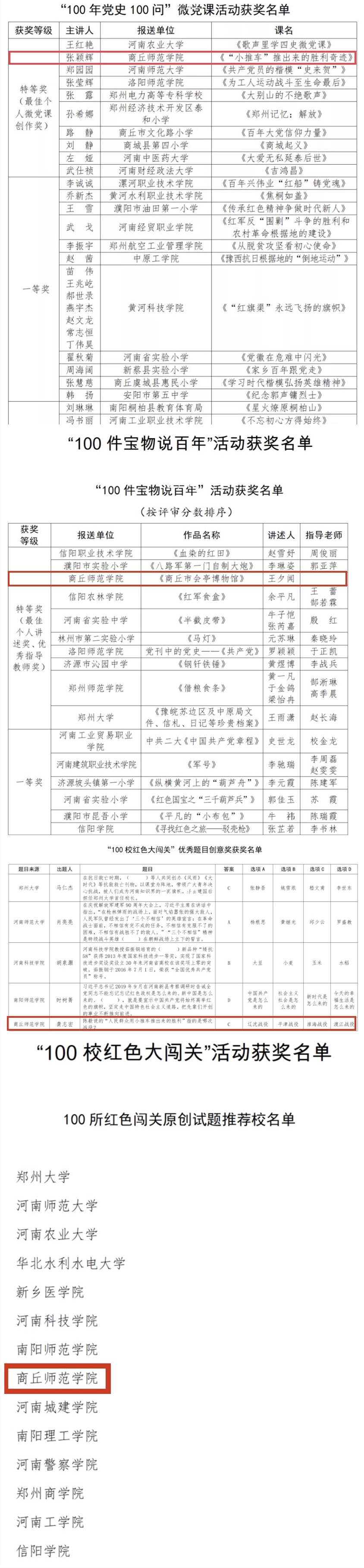 其中,由校团委报送的微党课《“小推车”推出来的胜利奇迹》(主讲人:校团委宣传部部长张颖辉),荣获“100年党史100问”微党课活动特等奖。由校党委宣传部报送的《商丘市会亭博物馆》(讲述人:校报编辑部主任王夕闻),荣获“100件宝物说百年”活动特等奖。由马克思主义学院党委书记龚志宏在“100校红色大闯关”活动中提供的题目荣获优秀题目创意奖。纽约国际官网在“100校红色大闯关”活动中荣获100所红色闯关原创试题推荐校荣誉。