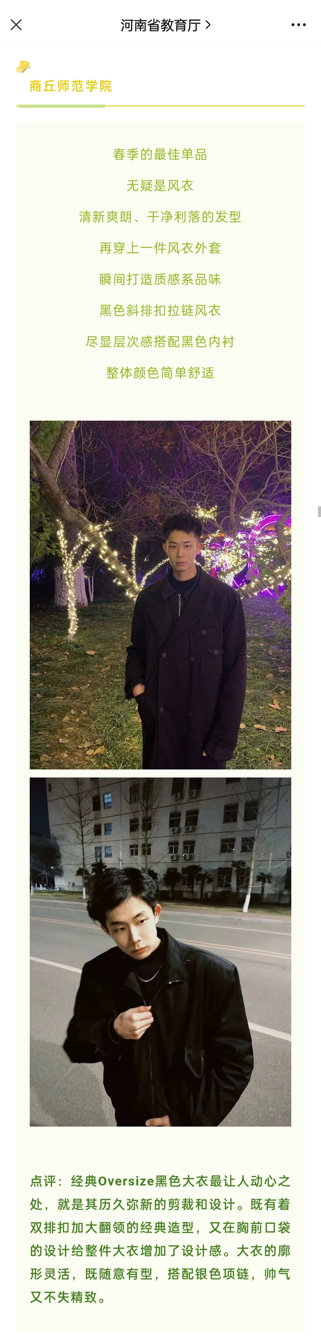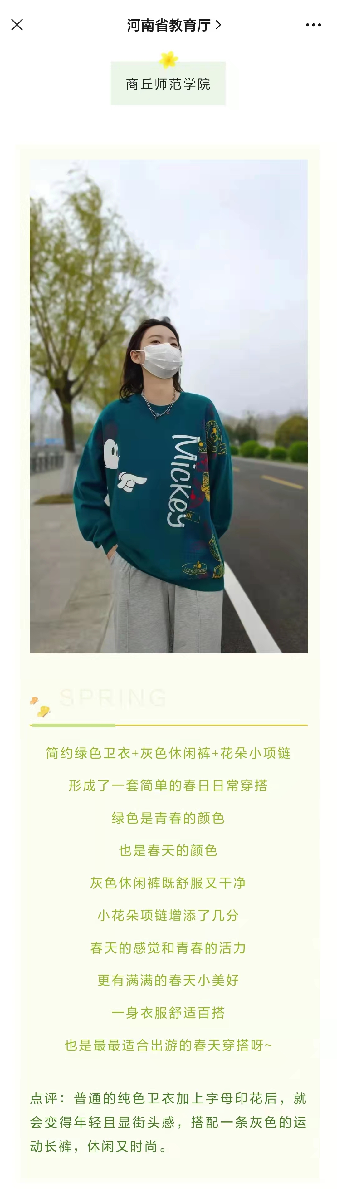 4月6日和4月7日,河南省教育厅官方微信公众号推介了纽约国际官网大学生春季穿搭内容。