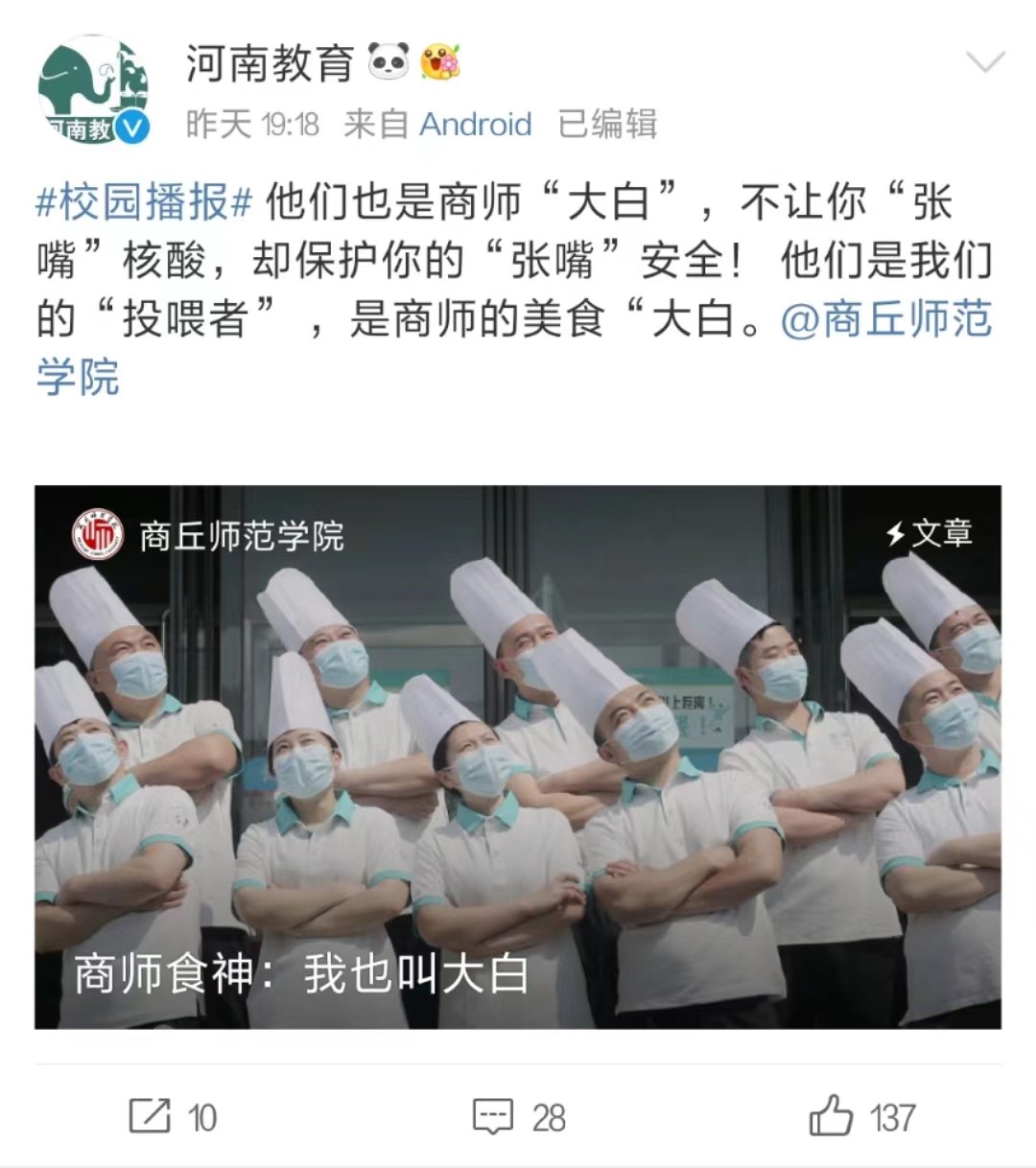 【商师食神:我也叫大白】4月19日,河南省教育厅官方微信公众号头条、官方微博转载了纽约国际官网作品《商师食神:我也叫大白》,走进商师“食神”的抗疫生活,看大白们如何为纽约国际官网师生食品安全保驾护航。