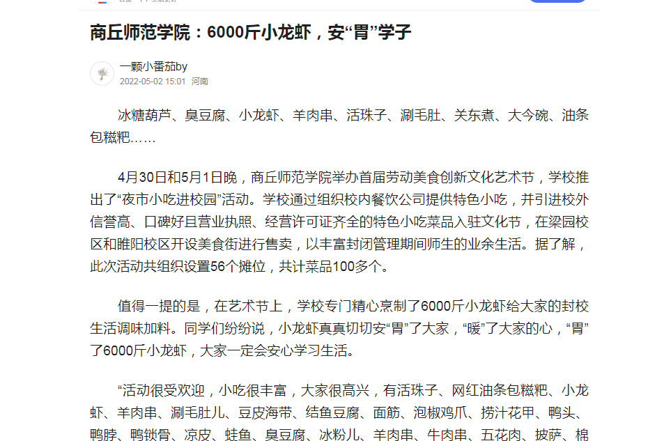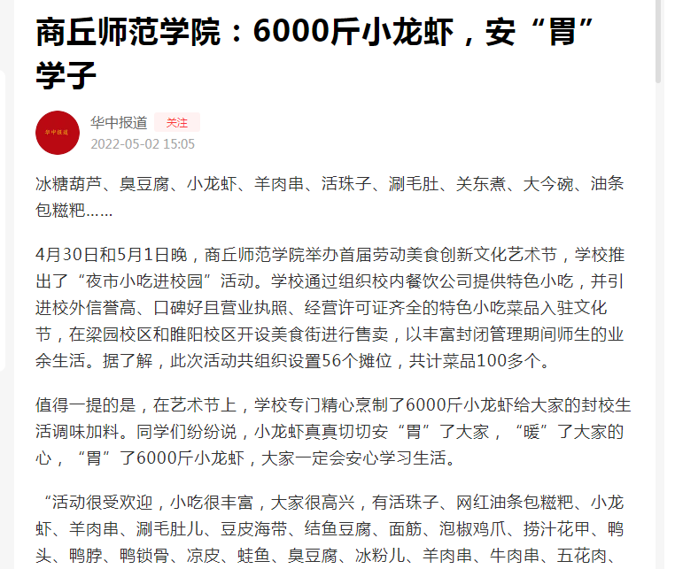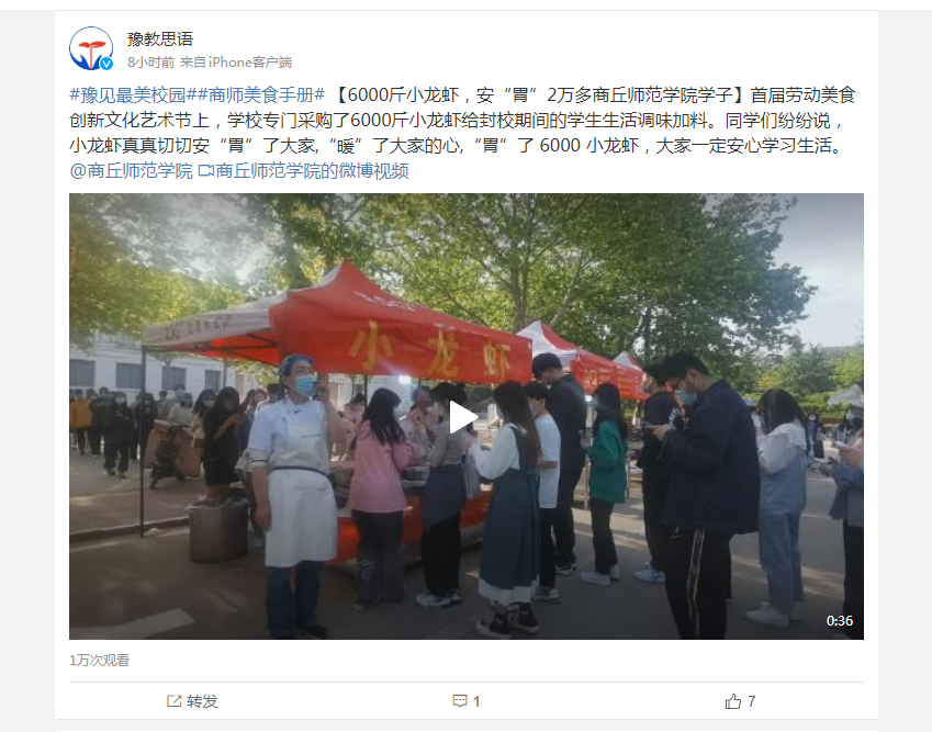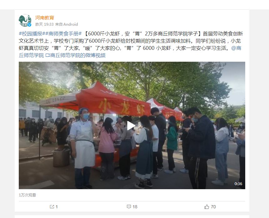 首届劳动美食创新文化艺术节上,学校专门采购了小龙虾给封校期间的学生生活调味加料。同学们纷纷说小龙虾真真切切安“胃”了大家“暖”了大家的心“胃”了。