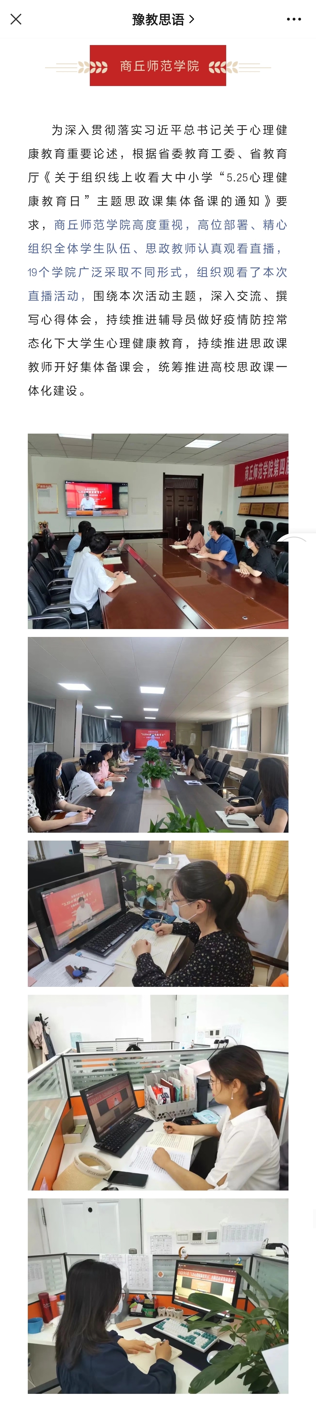 5月25日上午,由省委教育工委、省教育厅主办,南阳市教育局、南阳师范学院承办的全省大中小学“5.25心理健康教育日”主题思政课集体备课活动在线上展开。全省各高校结合当前疫情防控形势和要求,积极组织教师在线观看,大家深入学习,热烈讨论。下面和思语一起来看看,河南各学校的观看学习情况。
