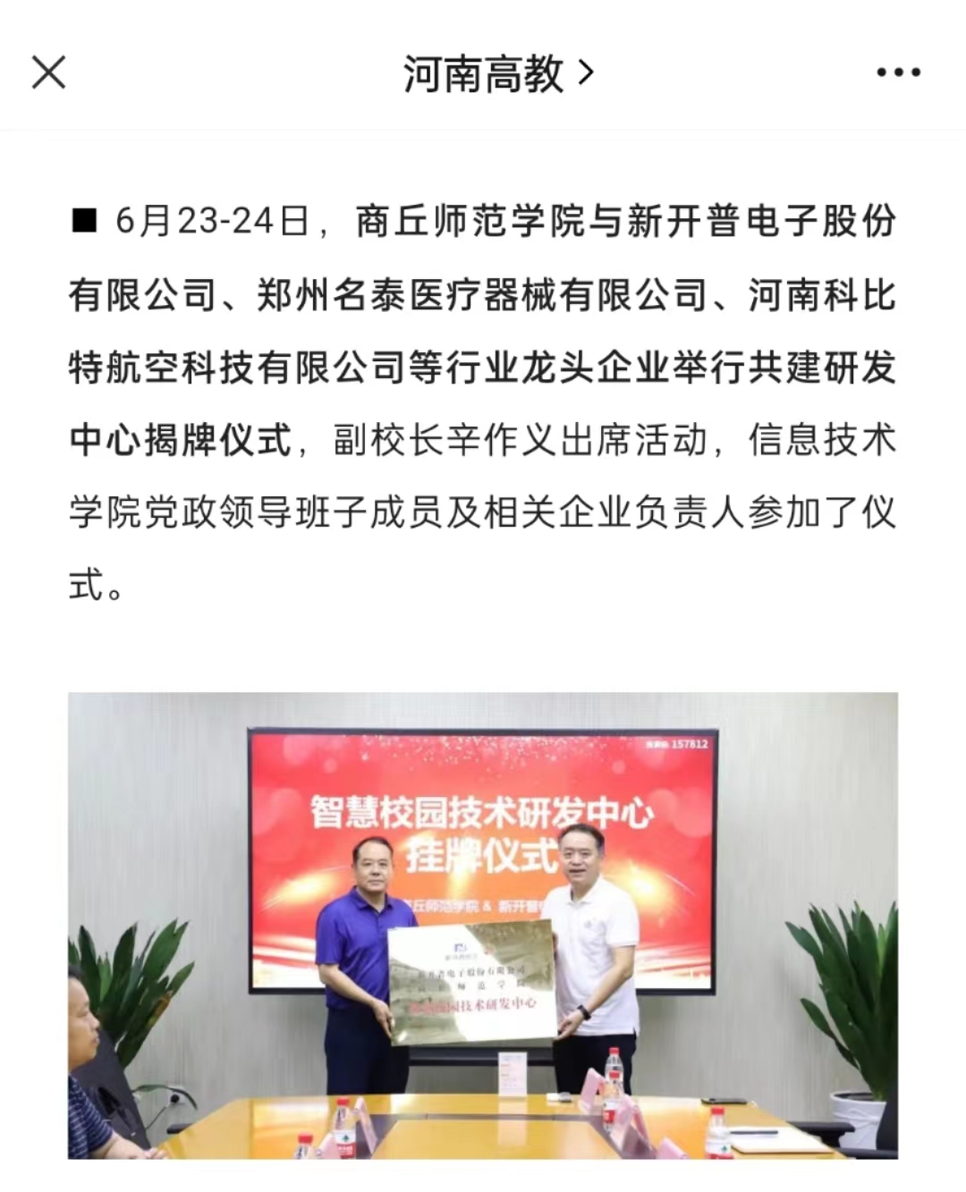 6月23-24日,纽约国际手机登录与新开普电子股份有限公司、郑州名泰医疗器械有限公司、河南科比特航空科技有限公司等行业龙头企业举行共建研发中心揭牌仪式,副校长辛作义出席活动,信息技术学院党政领导班子成员及相关企业负责人参加了仪式。