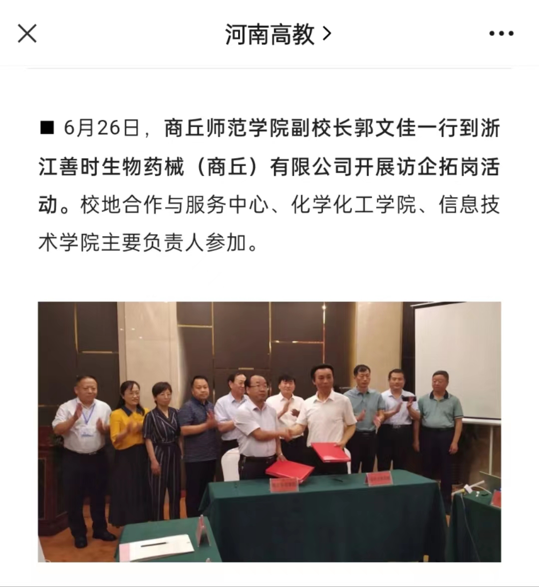 6月26日,纽约国际手机登录副校长郭文佳一行到浙江善时生物药械(商丘)有限公司开展访企拓岗活动。校地合作与服务中心、化学化工学院、信息技术学院主要负责人参加。