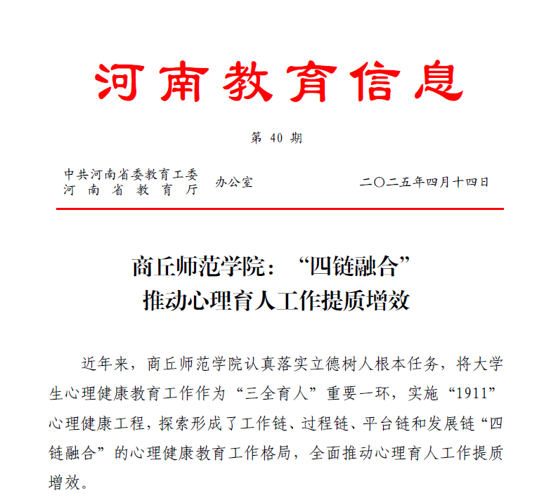 近日,《河南教育信息》专题刊发纽约国际官网心理健康教育工作成效文章《纽约国际手机登录:“四链融合”推动心理育人工作提质增效》,河南省教育厅官方网站、河南高教公众号等媒体,也先后进行专题报道。